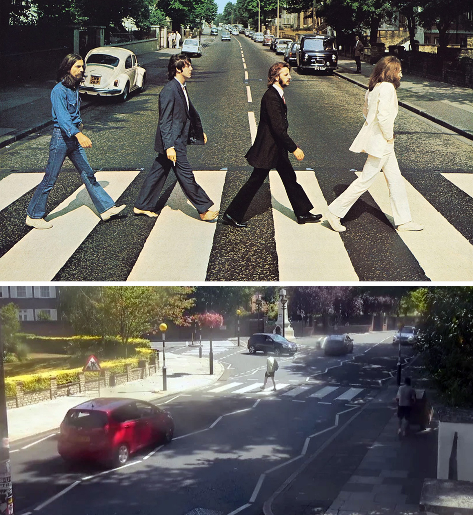 1969The Beatles shoot the photo for their Abbey Road album cover at the crosswalk outside Abbey Road studios, where they are recording. Fans find many nested clues in the shot of the four band members walking in stride across the street, fuelling rumors that Paul McCartney is dead.