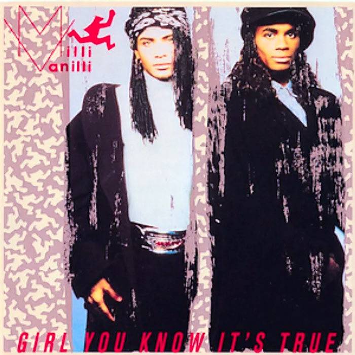 1989Performing on the Club MTV tour at a stop in Bristol, Connecticut, Milli Vanilli's tracks go screwy when they try to lip-synch to the song "Girl You Know It's True." As the line "girl you know it's..." repeats over and over, the duo panic and scurry off stage. It is later revealed that they didn't sing on their album.